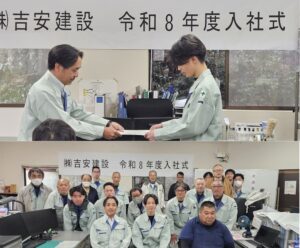 令和8年4月1日、新卒入社式を開催しました。はじめに社長より新入社員へ向けての歓迎の挨拶がありました。
